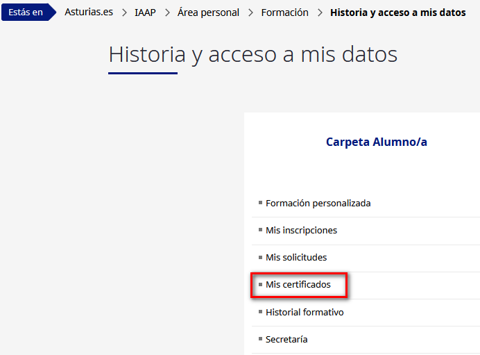 Una vez dentro del Área Personal, esta es la ruta: Formación – Historia y acceso a mis datos – Carpeta alumno/a – Mis certificados